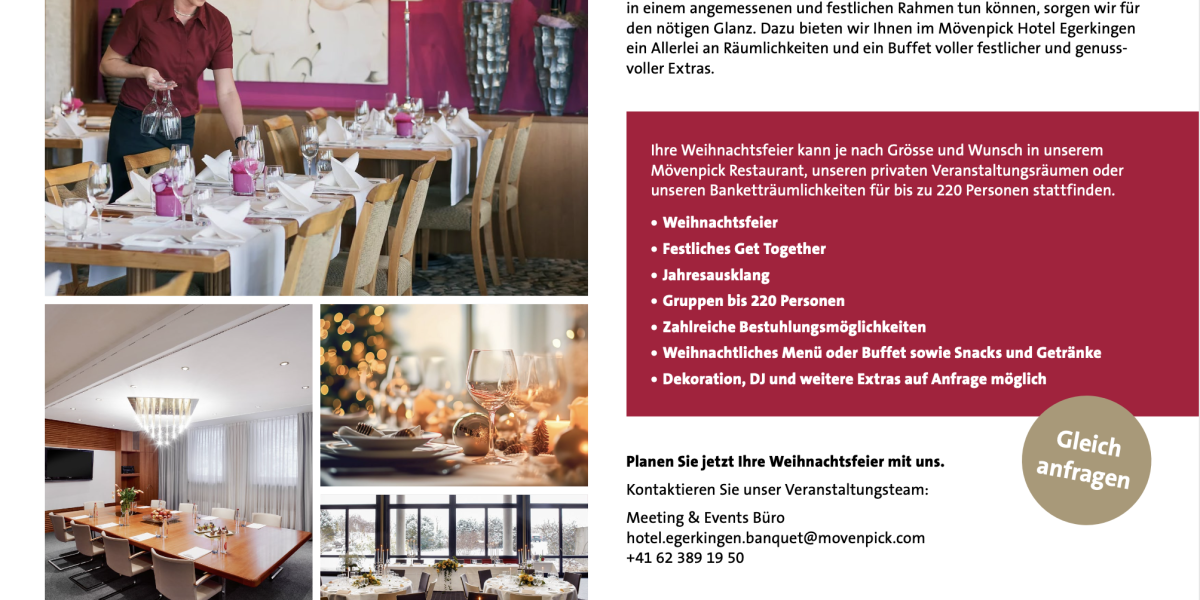 Ihre Weihnachtsfeier kann je nach Grösse und Wunsch in unserem Mövenpick Restaurant, unseren privaten Veranstaltungsräumen oder unseren Banketträumlichkeiten für bis zu 220 Personen stattfinden.